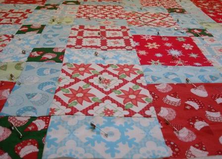 I can't look at those Santa-gnomes and not smile. I pieced this table topper the other day, quilted it on Sunday and bound it yesterday. An easy project!